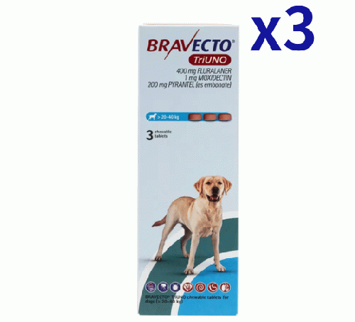 ブラベクトトリウノ >20-40kg | 3錠x3箱 | ノミ | マダニ | フィラリア